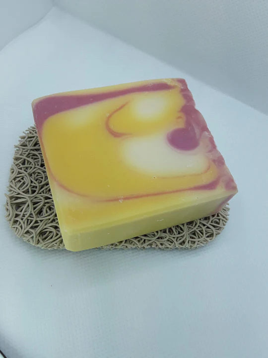 If you like sweet, coconut and anything tropical, this is for you. Bright swirls of yellow and pink decorate this tropical beauty and make you wish you had a nice frozen drink on the beach. We can't deliver on those last two, but the soap is all yours!