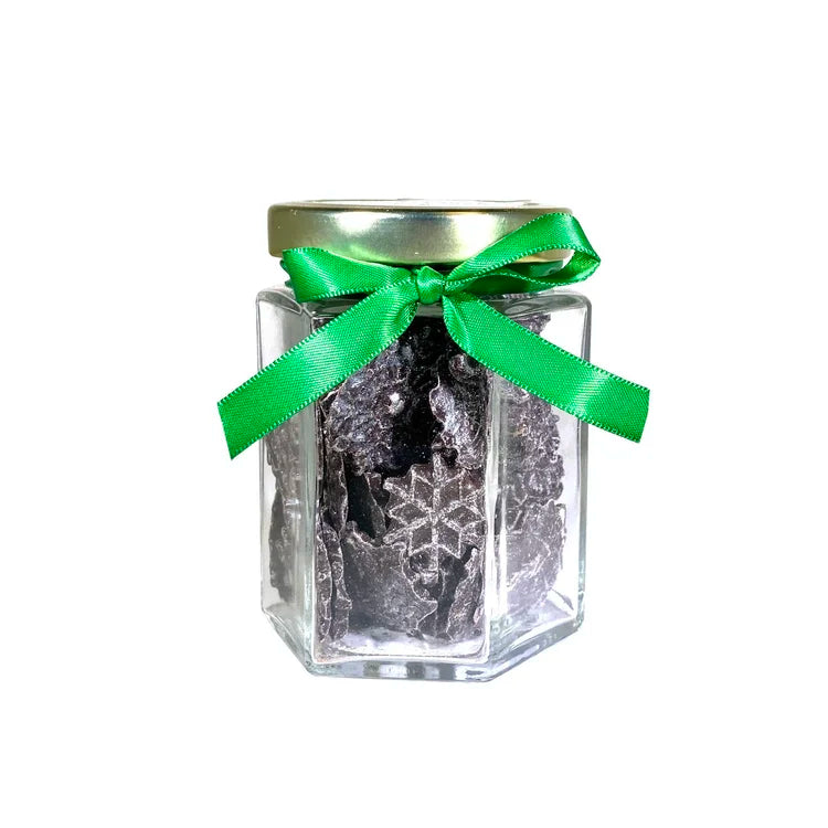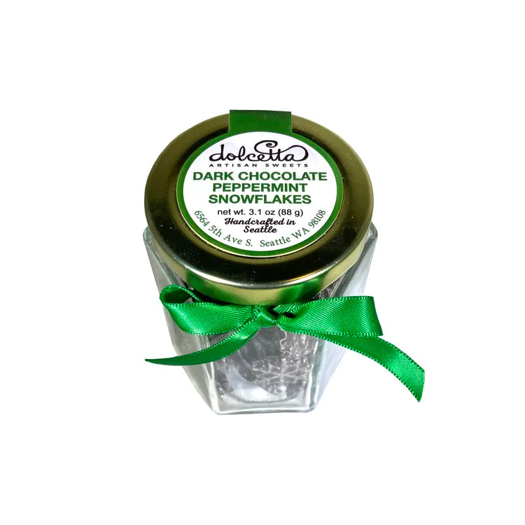 Shimmering dark chocolate wafers flavored with pure peppermint oil. Netflix and chill the night away with a jar of these cool treats.